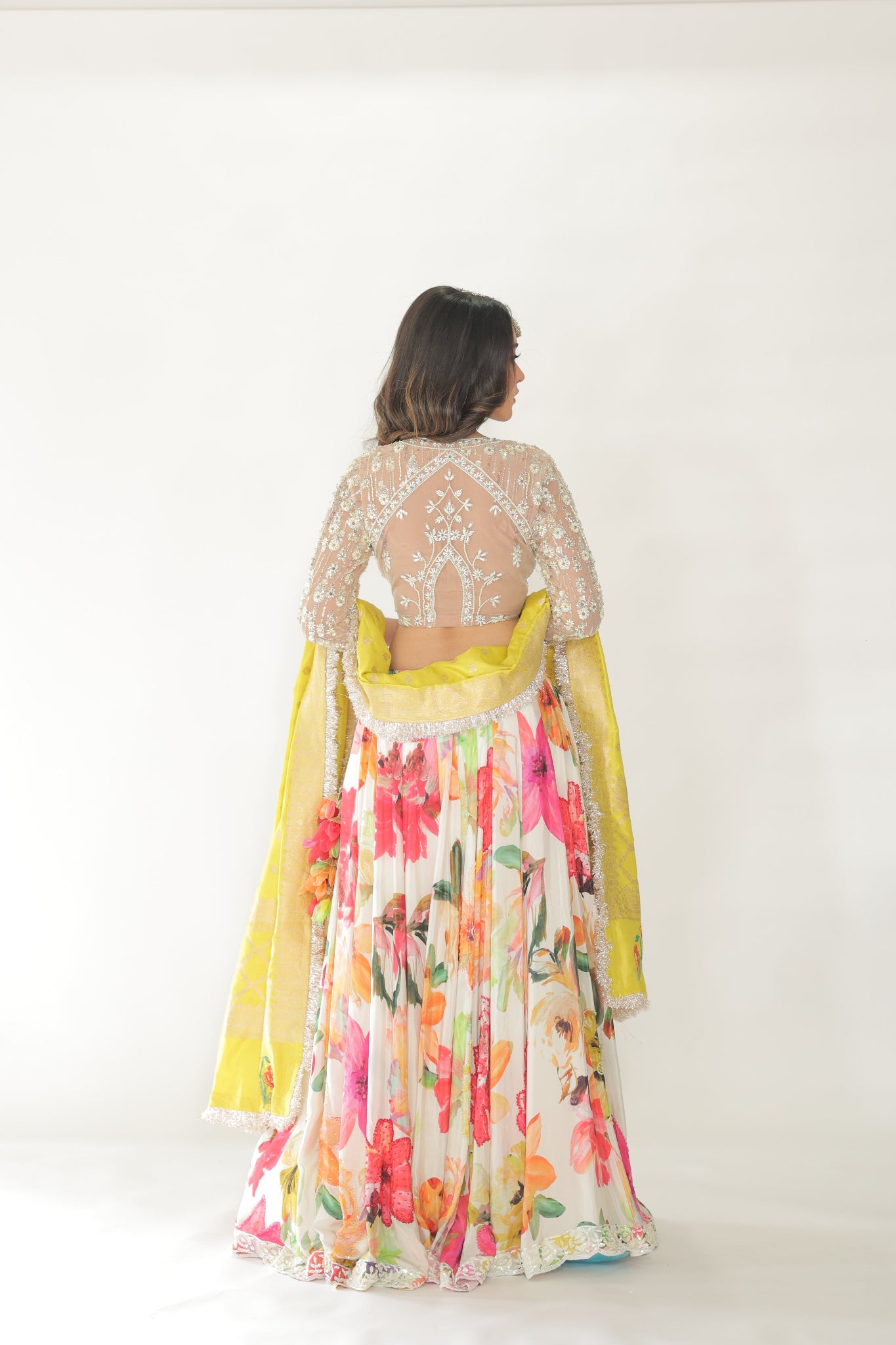A masterpiece of elegance — this floral lehenga is paired with a nude skin-feel blouse, hand-embroidered with fine cutdana and sequins, and finished with a lustrous silk dupatta. Crafted for timeless celebrations.
