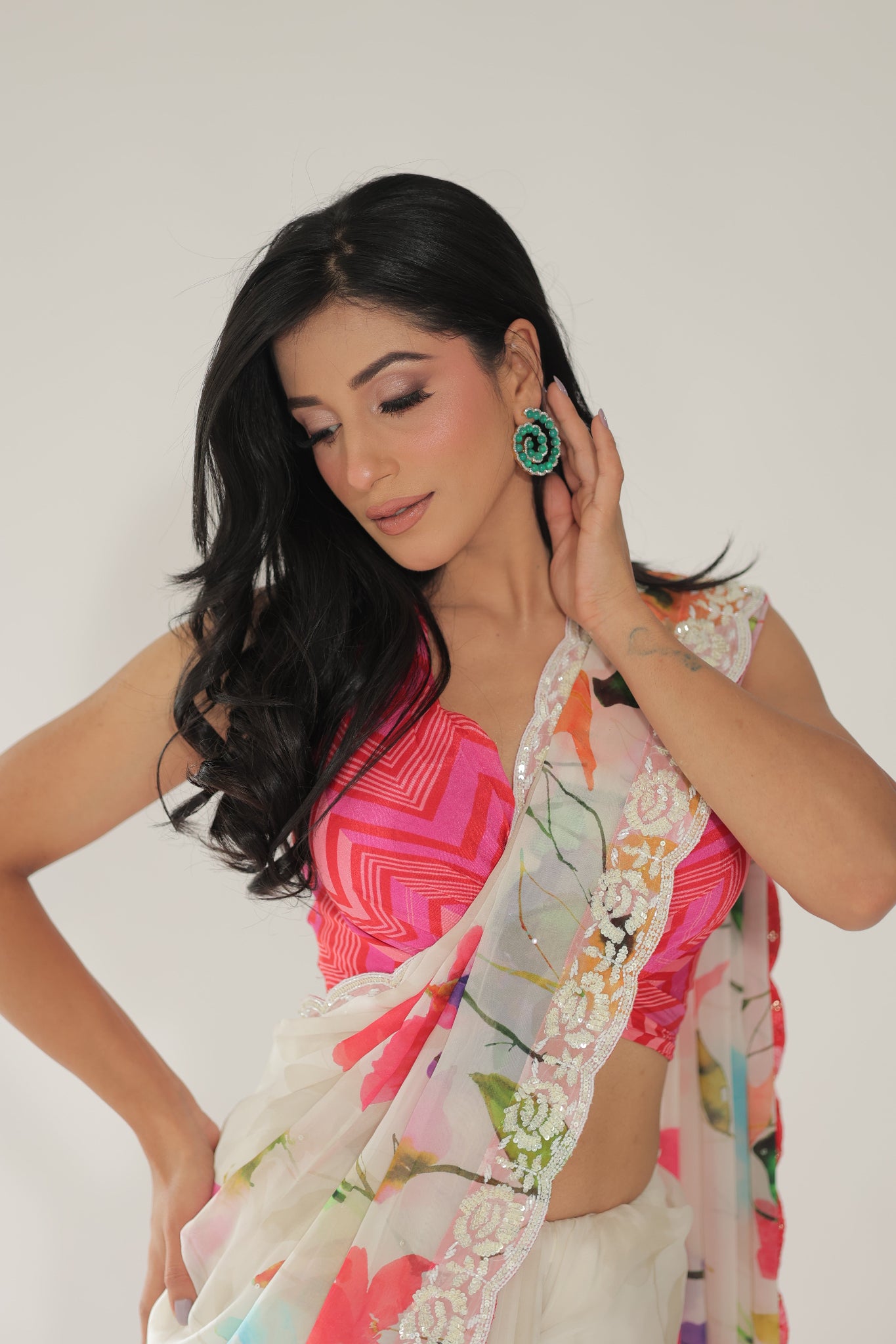 JM Floral Saree with a hot pink halter blouse, hand-embroidered with cutdana and sequins, featuring elegant tassels on the palla.