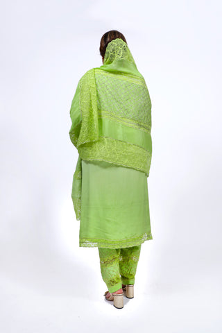 An Ombre Shaded Lime Cream colored Kameez with Real Mulberry Silk (chinnon) fabric has delicate lace at the neck and dramatic sleeves with inserted lace work and badla jaal embroidery. It is paired with a Straight JM Salwar and chinnon-chiffon duppatta with badla jaal and lace work edging.