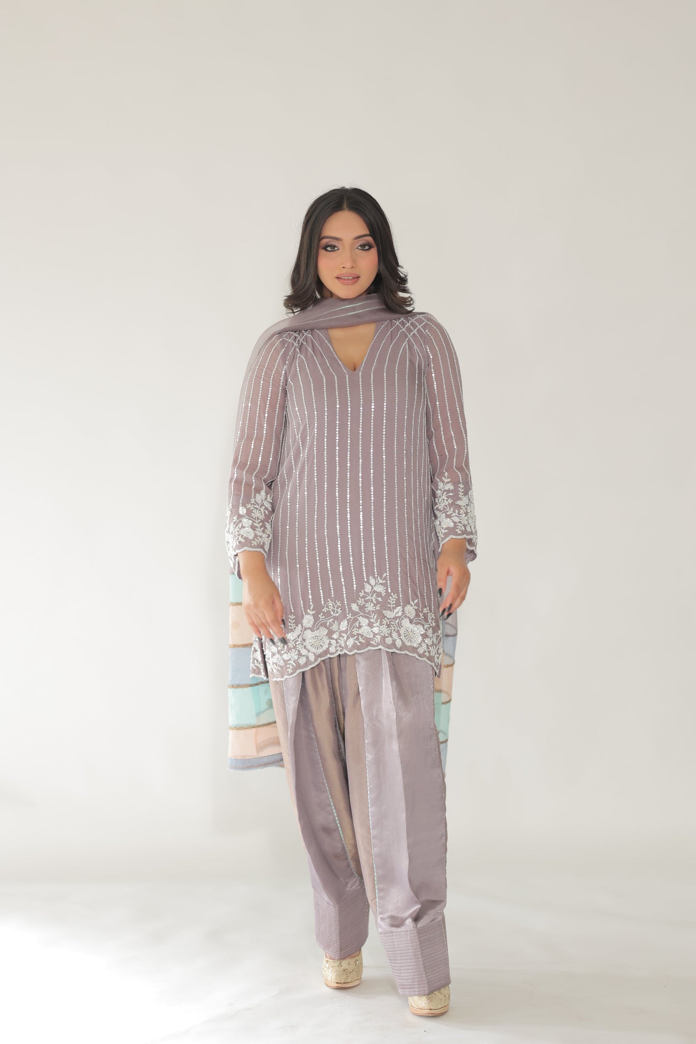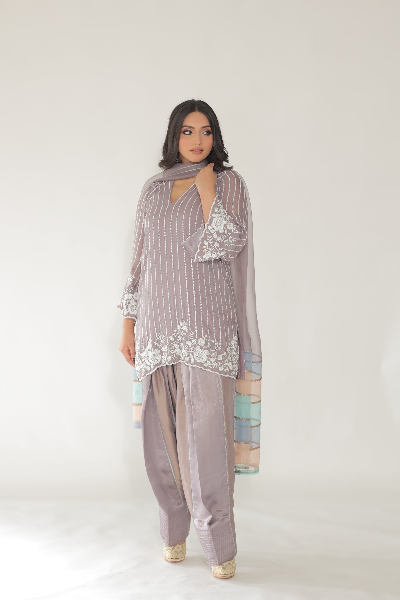 From our Sitara Collection, a moonstone lilac shirt paired with JM Farsi Salwar, hand-embroidered with delicate sequins and cutdana. Effortless elegance and timeless luxury in every stitch.