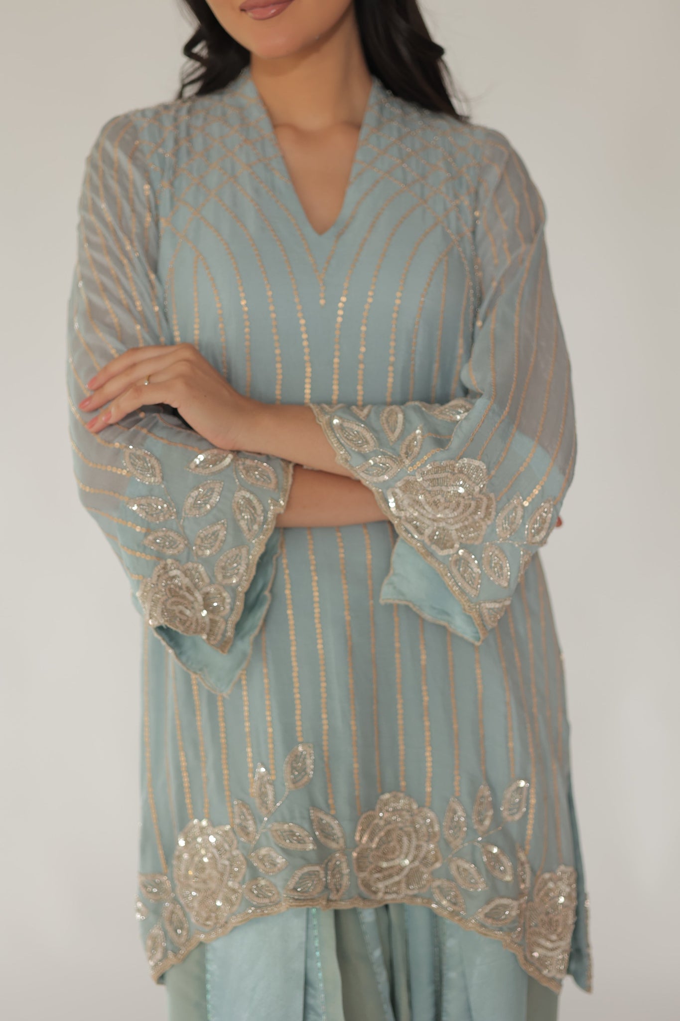 From our Sitara Collection, a powder blue shirt paired with JM Farsi Salwar, hand-embroidered with delicate sequins and cutdana. Effortless elegance and timeless luxury in every stitch.